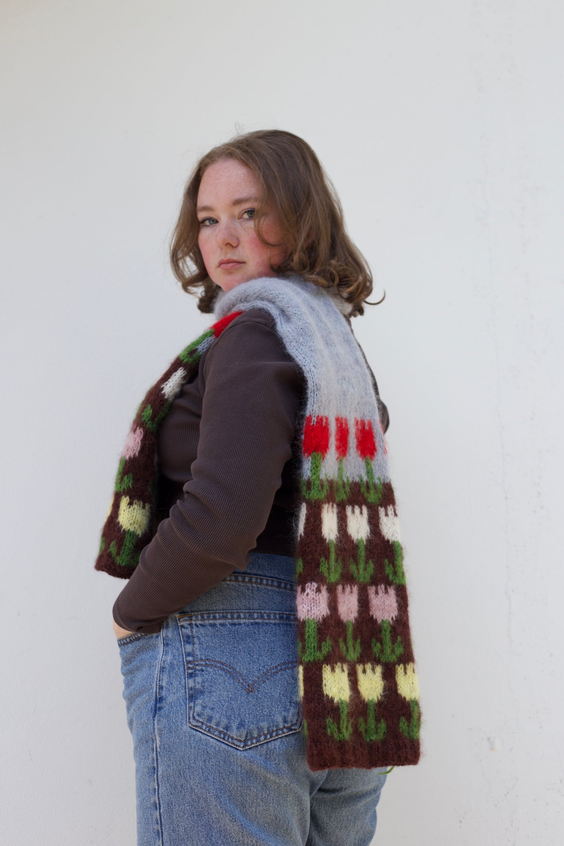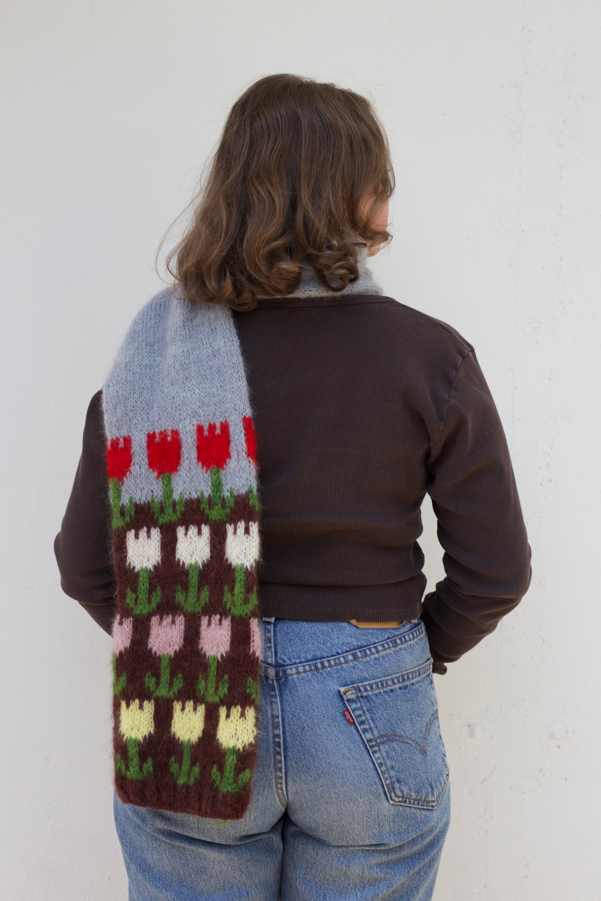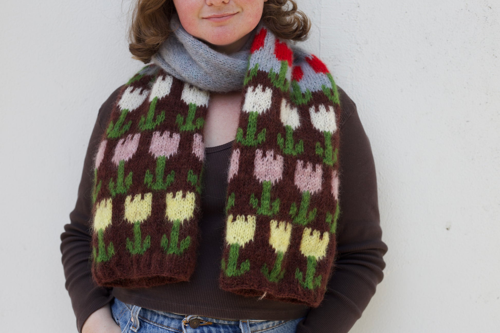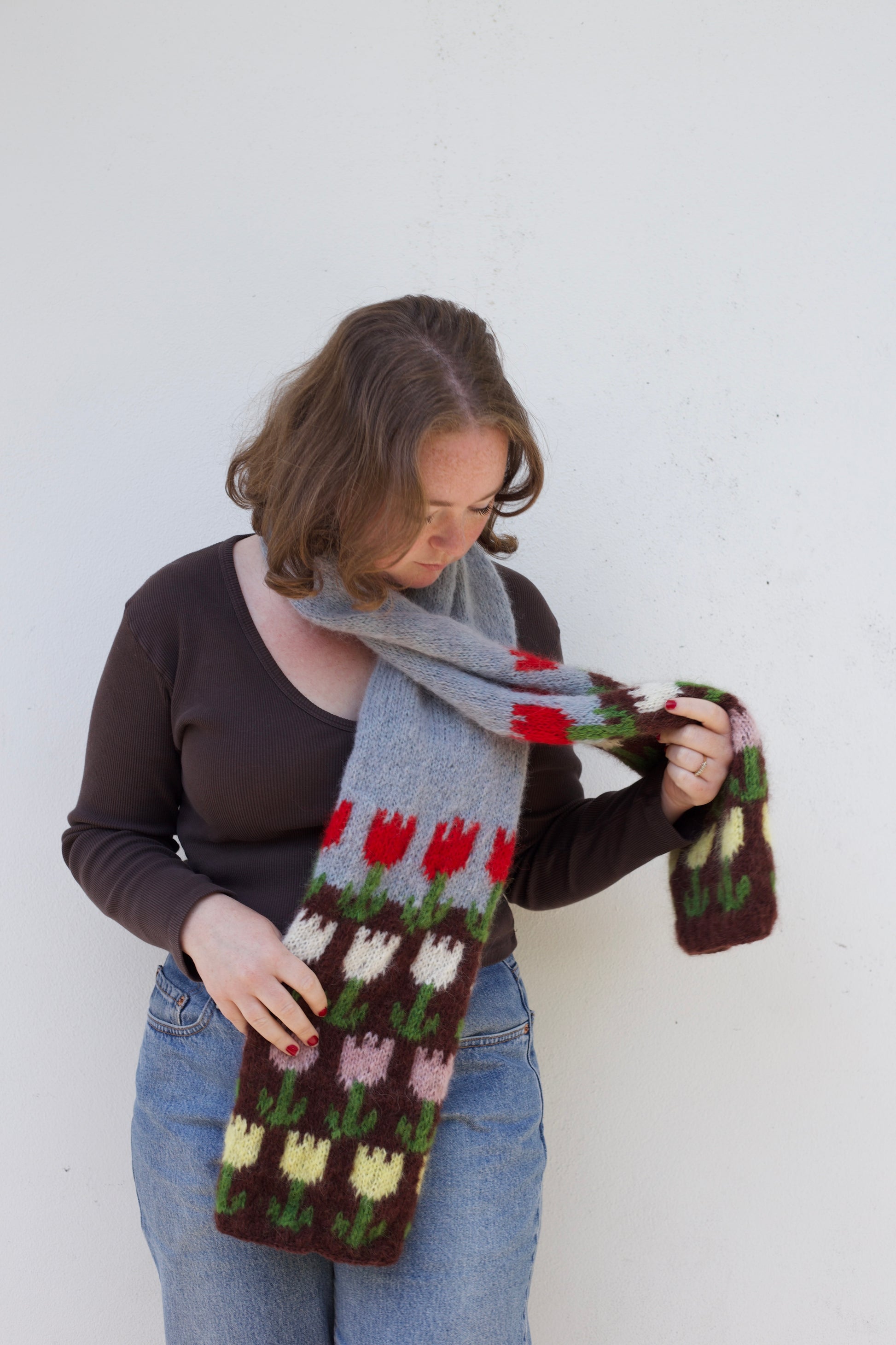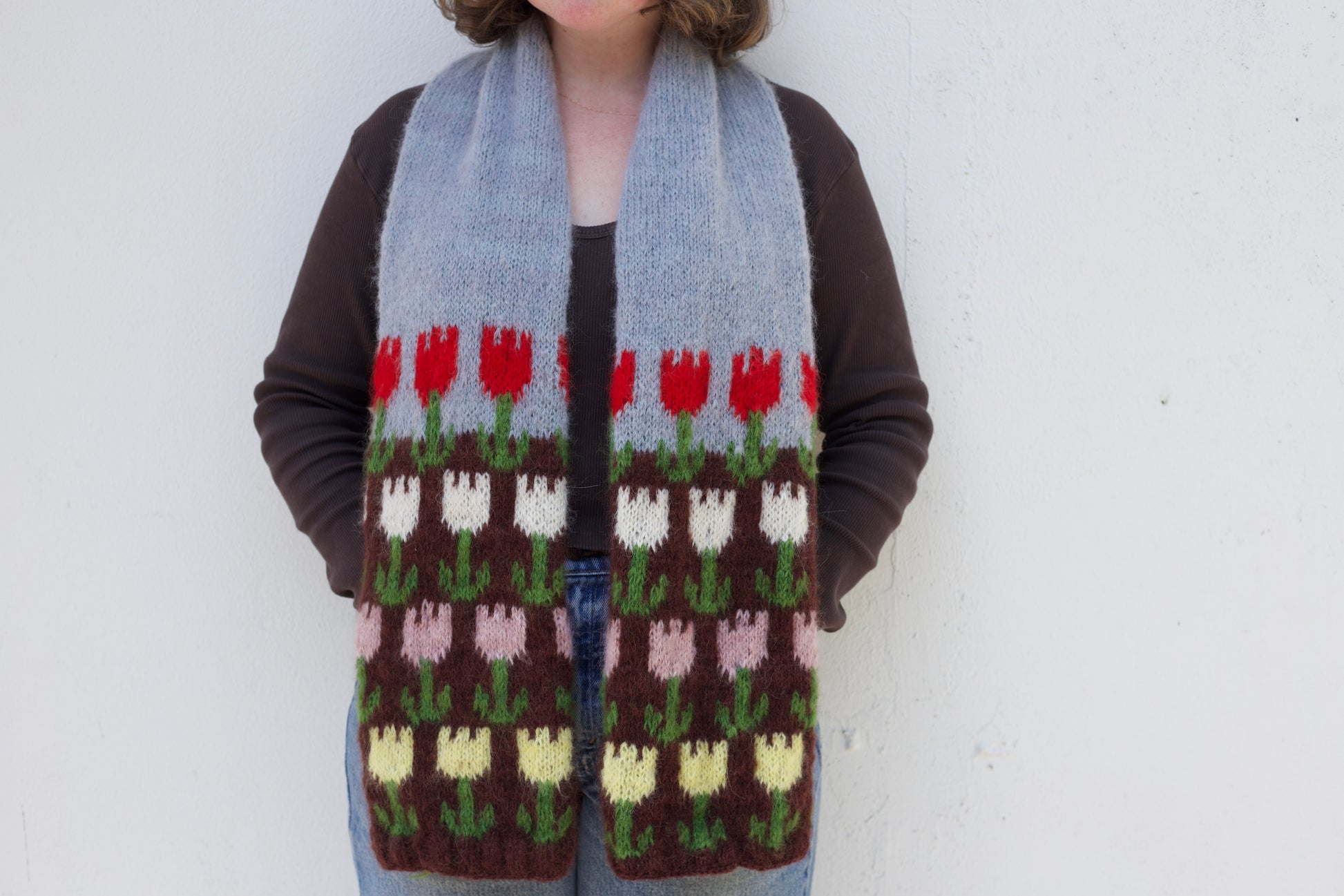 Tulip Farm Scarf is meant to be worn wrapped once or draped around the neck (see pictures). The scarf is knit in the round throughout the whole pattern.